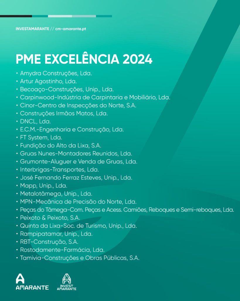 O Município de Amarante felicita as empresas do concelho distinguidas com o Estatuto PME Excelência 2024 – um selo de reputação atribuído pelo IAPMEI – Agência para a Competitividade e Inovação e pelo Turismo de Portugal, em parceria com bancos parceiros e o Grupo Banco Português de Fomento.